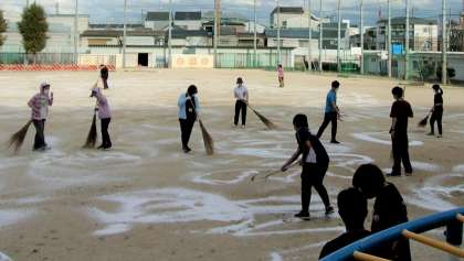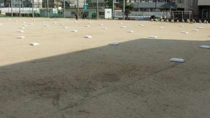 「にがり」の入った袋を運動場に均等に並べ、袋から中身を出し、竹ぼうきで広げていきます。