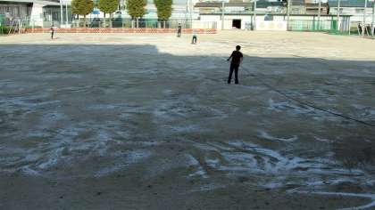 本日の放課後、運動場に、教職員が協力して「にがり」をまきました。
