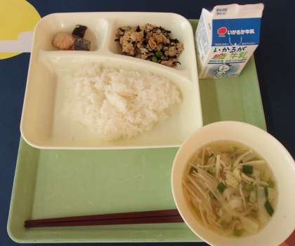 さけのしょうゆ風味焼き、五目汁、高野どうふのいり煮、ごはん・牛乳