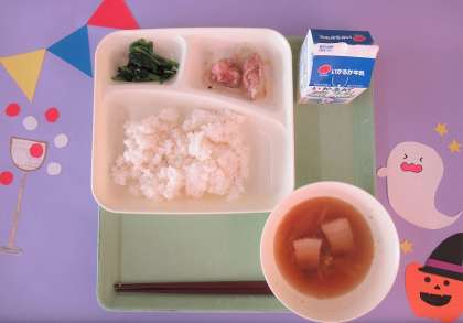 鶏肉のゆず塩焼き、ソーキ汁、ほうれんそうのおひたし、ごはん・牛乳