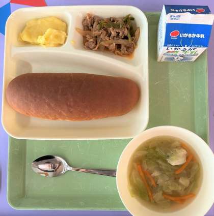豚肉と野菜のケチャップソテー、スープ、スイートポテト、パン・牛乳