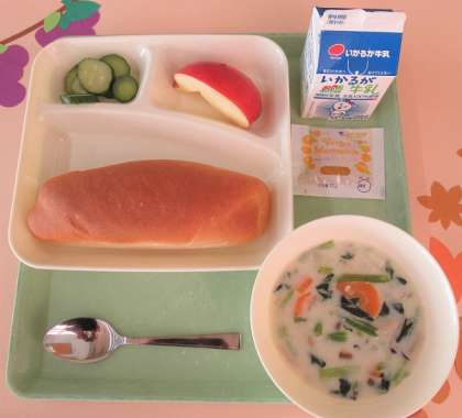 きのこのクリームシチュー、きゅうりのバジル風味サラダ、りんご、パン・牛乳、マーマレード