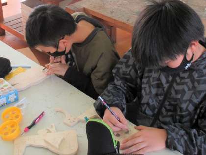 テープカッター台をつくります。糸ノコ盤や彫刻刀を使いますが、危なげなく丁寧に、こだわりの作品に仕上げていきます。