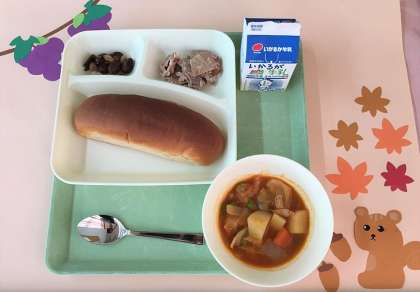豚肉のガーリック焼き、ケチャップ煮、うずら豆のグラッセ、パン・牛乳