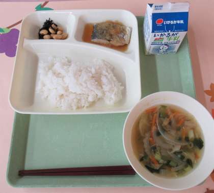 さごしのおろしじょうゆかけ、さといものすまし汁、大豆の煮もの、ごはん・牛乳