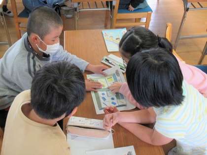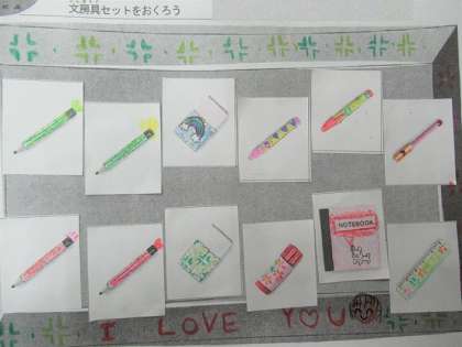 えんぴつ、ノート、ペン、消しゴム…、文房具のカードがプリントに貼り、色をぬり、お気に入りの文房具セットをつくります。