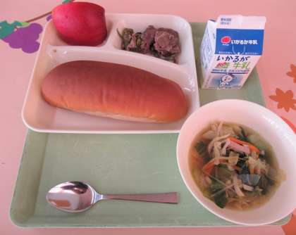 牛肉のオイスターソース焼き、中華スープ、りんご、パン・牛乳