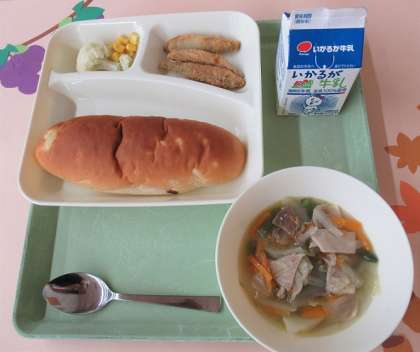 わかさぎフライ、スープ、カリフラワーとコーンのサラダ、パン・牛乳