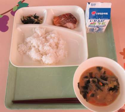 あかうおのしょうゆだれかけ、みそ汁、こまつなのいためもの、ごはん・牛乳