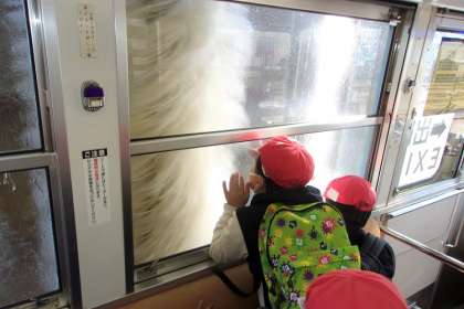 電車に乗ったまま、洗車機を通り抜ける体験もしました。