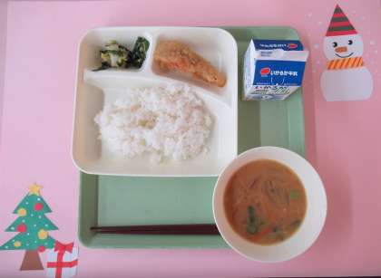 たらのフライ、さつまいものみそ汁、きくなとはくさいのごまあえ、ごはん・牛乳