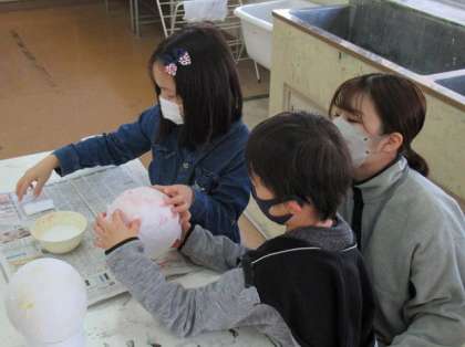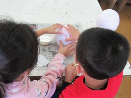 お友だちに手伝ってもらいながら、風船に和紙を貼りつけていきます。