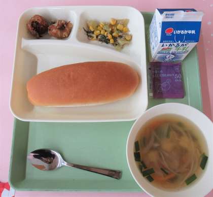 あげシューマイ、とうふのスープ、ツナとチンゲンサイのいためもの、パン・牛乳、ブルーベリージャム