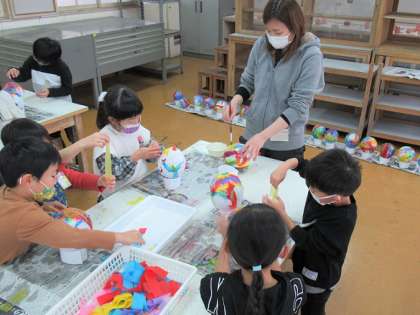 白い和紙の風船に、色とりどりの和紙を重ねていきます。
