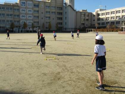 ミニハードルを「1.2、3、トン」のリズムで跳ぶ練習をしました。