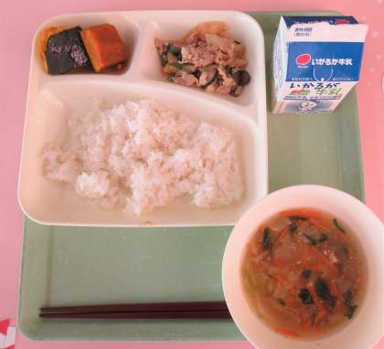 豚肉と干しずいきのみそ煮、うすくず汁、焼きかぼちゃの甘みつかけ、ごはん・牛乳