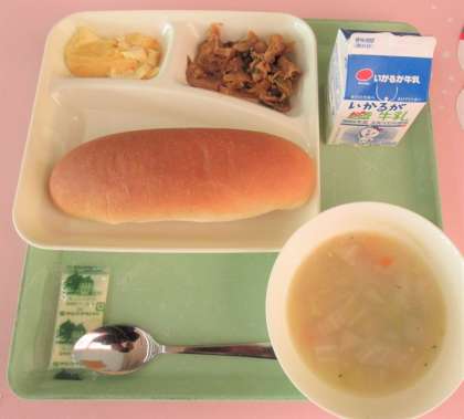 豚肉のケチャップソテー、コーンスープ、焼きプリン、パン・牛乳、ソフトマーガリン