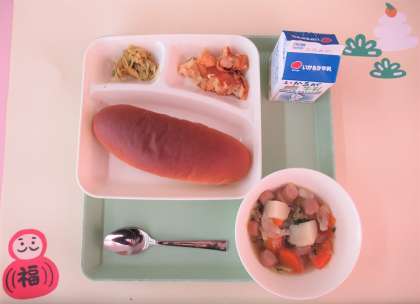 ポトフ、カレーソテー、桃のクラフティ、パン・牛乳