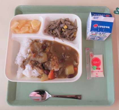 牛肉と金時豆のカレーライス、ごぼうサラダ、パインアップル(カット缶)、牛乳