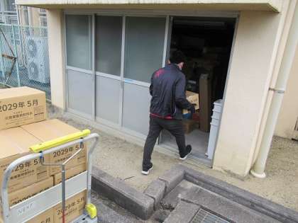 阪神・淡路大震災が発生した日に、災害備蓄用飲料水が届きました。備蓄倉庫に保管しました。