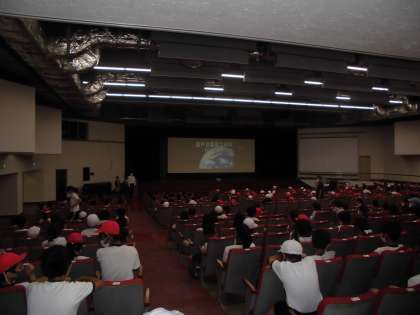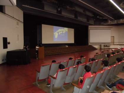 最初は、講堂で児童会代表委員会の人たち中心に発表してもらい