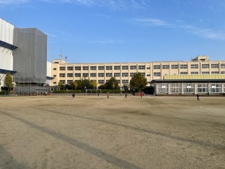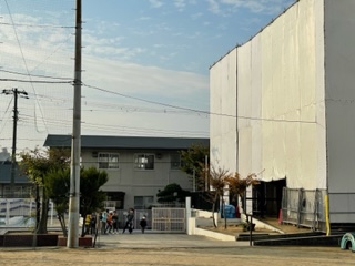外壁工事の足場もどんどんできあがり、西校舎が白いシートで覆われています。