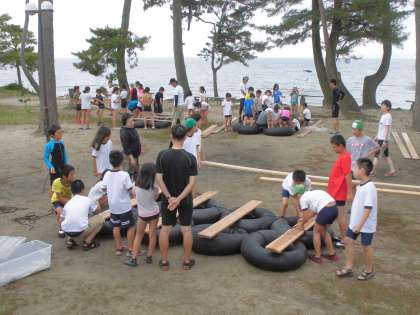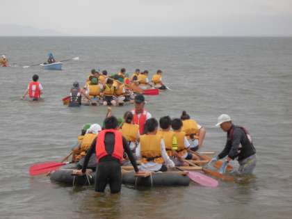 5年生野外活動の最終日は、朝から掃除などの退出準備をしました。その途中に少し雨が降ってきましたが、予定通りいかだ作りを行いました。トラックのタイヤチューブ8本と、6枚の板材をロープで縛りつけ、いかだを作ります。うまく縛らないと、湖上に繰り出した後、いかだはばらばらに壊れてしまいます。班で力を合わせ、頑丈ないかだを作りました。その後、そのいかだに乗り込み、湖上に漕ぎ出して遊びました。前日に行ったカッター訓練の厳しさとは違った楽しさがあり、みんな大喜びでした。