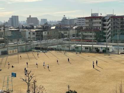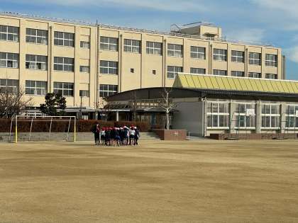 朝の寒い中、運動場では元気に体育をしています。