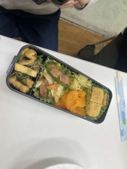 出来上がったおかずをお弁当箱に詰めています。隙間ができないように工夫して詰めることができました。