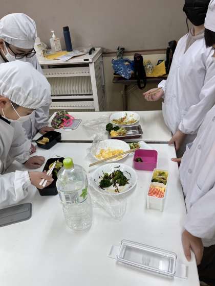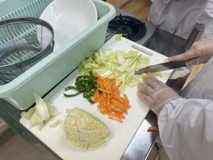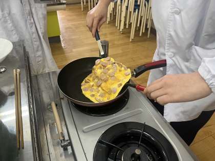 班のメンバーで相談しながら 焼き方を工夫しています。フライ返しを上手に使って、ひっくり返すことができていました。