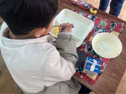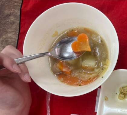 ポトフの中にはハート型のラッキーにんじんが入っていました。デザートの焼きプリンは甘くておいしい!と大人気でした。