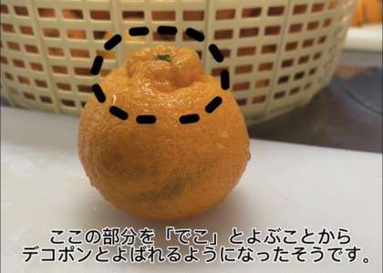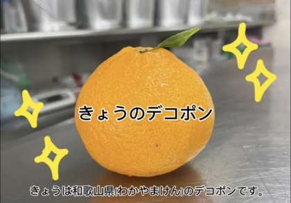 栄養教諭が作成したデコポンの動画を教室で見ました。デコポンの名前の由来がデコポン頭部の飛び出ているところに関係していることを知ると、「でこがあるからデコポンか〜!」と驚いていました。