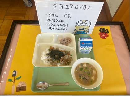 今日の献立は 鶏ごぼうご飯 とうふのみそ汁 焼きれんこん です。