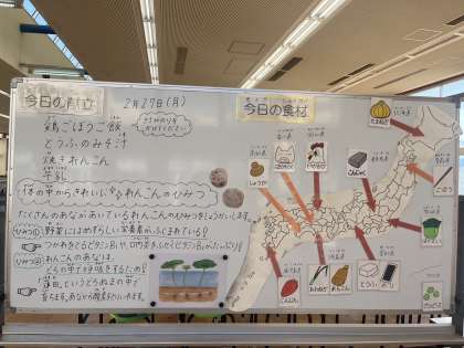 焼きれんこんはシャキシャキとした歯応えが人気の一品です。れんこんの穴はなぜ空いているのか、どこでできる食べ物なのかを給食ホールのホワイトボードで確認しました。