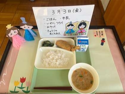 給食ホールでは桃の節句のお話を掲示しています。給食を取りに行く時に読みます。