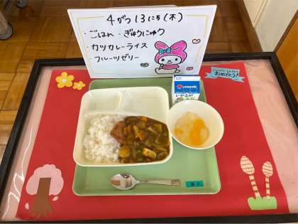 今日は入学・進級をお祝いする献立です。大人気のカレーライスの上には、肩ロースの一口トンカツを乗せていただきます。フルーツゼリーは、みかんゼリーと和なし(カット缶)を混ぜたデザートです。