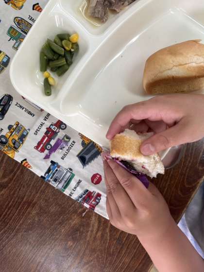 給食が始まって1週間が経ちました。一年生も給食に少しずつ慣れていている様子が見られます。今日はコッペパンにブルーベリージャムがつきました。先日のいちごジャムを食べるときはお皿やナプキンにジャムが付いてしまっていた子も、今日は上手にジャムを付けて食べることができていました。