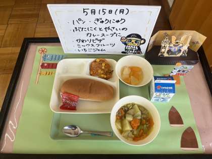5/15の献立は、コッペパン、豚肉と野菜のカレースープ煮、変わりピザ、ミックスフルーツ(缶)、牛乳、いちごジャムです。