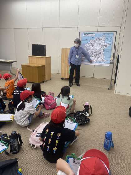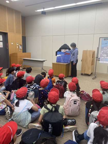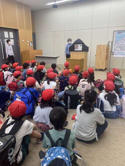 住吉図書館に着きました。たくさんの本に興味津々。紙芝居や大型絵本の読み聞かせをしていただき、図書館の使い方や、楽しみ方について知りました。