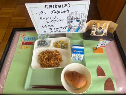 5/18の献立は、黒糖パン、ミートソーススパゲッティ、レタスとコーンのサラダ、ミニフィッシュ、牛乳です。