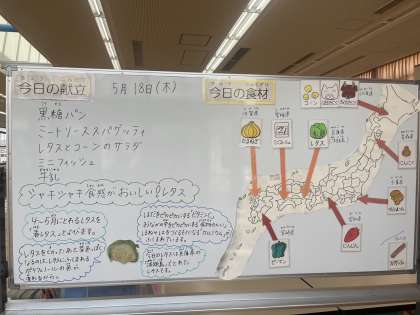 レタスは4〜5月に収穫されるものを春レタスといいます。今日のサラダは、りんご酢や砂糖、塩、うすくちしょうゆで作ったドレッシングを蒸したレタスとコーンに和えたものです。レタスのシャキシャキした食感とさっぱりした味付けがおいしかったです。