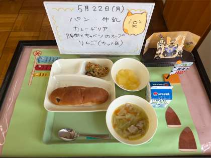 5/22の献立は、レーズンパン、カレードリア、豚肉と野菜のスープ、りんご(カット缶)です。