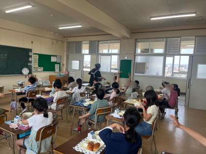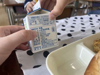 3時間目に3年生では、食育の時間でカルシウムについて知ろうという学習をしました。実際に飲んでいる牛乳を見て、カルシウムの量を確認しました。本当にカルシウムが227個入っている!とびっくりしていました。
