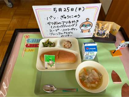 5/25の献立は、コッペパン、かつおのマリネ焼き(ノンエッグドレッシング)、スープ、グリーンアスパラガスのソテー、ソフトマーガリン、牛乳です。