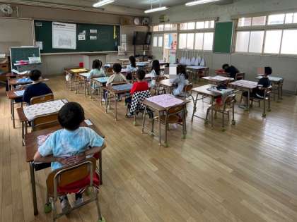 給食当番以外の子どもたちは、教室を立ち歩くとほこりが舞うので、座って静かに待ちます。かっこいい姿勢で待つことができていました。