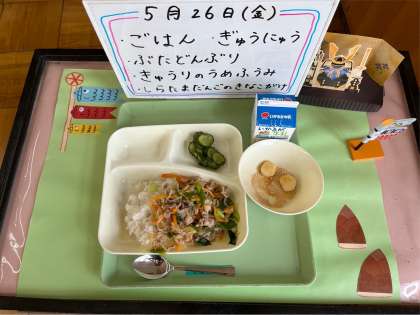 5/26の献立は、豚丼、きゅうりの梅風味、白玉だんごのきな粉がけ、牛乳です。