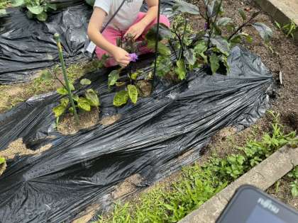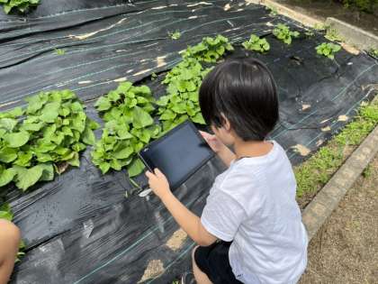 農園に植えた野菜の観察をしました。野菜がすくすく育って、見たことある野菜になっていることにみんな驚きでした。