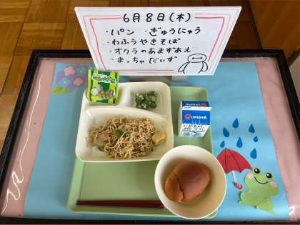 6/8の献立は、黒糖パン、和風焼きそば、オクラの甘酢あえ、まっ茶大豆、牛乳です。