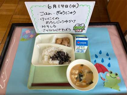 6/14の献立は、ごはん、鶏肉のおろしじょうゆかけ、みそ汁、魚ひじきそぼろ、牛乳です。