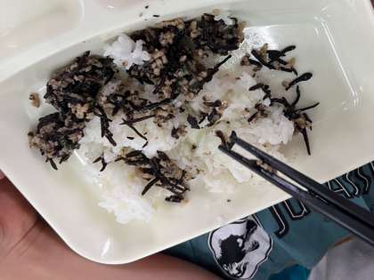 魚ひじきそぼろは、すけそうだらのミンチと、しそ、ひじきを甘辛く炊き、ご飯にかけて食べます。しそやひじきが食べ慣れていない子もいましたが、おいしい!とごはんをパクパク食べてくれる子もいました。